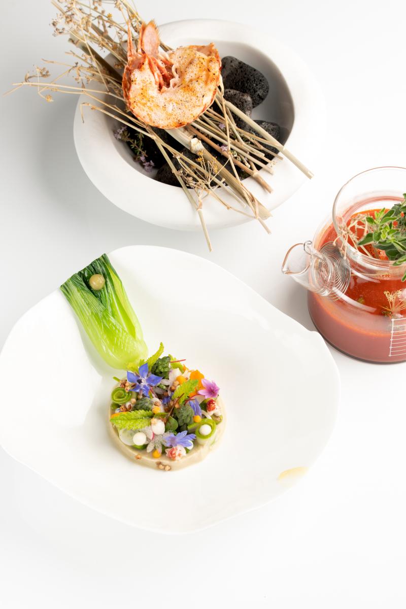 En coulisses, Stéphane Bourekba et le chef travaillent d’arrache-pied au sourcing, pierre angulaire de la cuisine de Christophe Chiavola. Tout ce qui ne pousse pas au potager fait l’objet d’une attention millimétrée : « 90 à 95% de nos ingrédients sont bio. La charcuterie ibérique, les céréales, le beurre, le fromage de chèvre… mes œufs viennent de l’Isle-sur-la-Sorgue, j’ai trouvé un safran bio près de La-Roque-sur-Cèze, mon jambon et mon veau dans un petit domaine au nord de la Drôme. J’ai même déniché un producteur de caviar français qui a développé un procédé pour ne pas tuer les esturgeons ! » Aujourd’hui encore, la quête du bon produit se poursuit. Notamment celle des agrumes : « Je ne me vois pas travailler sans. J’adore l’acidité, la bergamote, le yuzu, le calamansi… Ils apportent du peps. Un plat doit être beau, son ingrédient principal parfaitement cuit pour préserver sa saveur brute. Autour, on doit y retrouver du croquant, de l’acidité, pourquoi pas du torréfié et bien sûr des textures : du fondant, la légèreté d’une émulsion, et un jus corsé qui accompagne le plat comme un condiment. J’adore les expériences, je me méfie des réseaux sociaux, qui donnent envie de reproduire ce que d’autres ont déjà fait. »